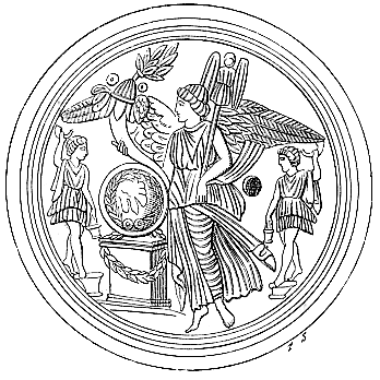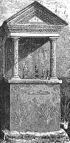 La figurine du Louvre citée plus haut fait la transition entre celle du Musée de Dresde et les Lares échansons qui, trouvés d'abord en Campanie, se rencontrent aujourd'hui dans un grand nombre de musées. En réalité, c'est la comparaison de ces statuettes avec les fresques de Pompéi qui met leur signification hors de doute. Et si l'on se demande pourquoi le type du Lare dansant s'est substitué peu à peu il celui du Lare guerrier qui figure sur le denier de la gens Caesia et dont Ovide déjà ne peut plus trouver de monuments, c'est à l'identification des Lares, tant avec le Genius qu'avec les Pénates, qu'il en faut demander la raison. La légende d'Enée a eu beau anoblir les Pénates, elle ne réussit pas à faire oublier leur fonction primitive qui est de pourvoir le garde manger. Au siècle de Constantin encore, un polémiste chrétien leur reproche de n'exprimer que les instincts les plus bas de la nature humaine, l'appétit de la boisson et de la nourriture. Les Lares héritèrent de ces attributions et leur confusion avec le Génie fit le reste. L'expression joyeuse, la danse, les fonctions d'échanson, la tunique légère, la couronne en tête, tous ces détails sont pris dans la littérature autant que dans l'opinion populaire et suffiraient, en dehors de la discussion sur le sens des plus anciens témoignages, pour assurer l'être des Lares contre toute interprétation funèbre, fût-elle corrigée par des intentions d'apothéose. |