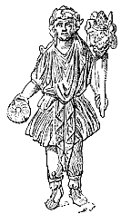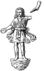 Il en est toutefois un autre qui semble antérieur et paraît correspondre à la notion du Lare unique, tel qu'on l'honorait dans les maisons aux premiers temps de la littérature romaine. Il nous est fourni par une statuette du musée de Dresde, qui représente une figure juvénile, à l'expression satisfaite, debout et au repos ; le corps est drapé dans une ample tunique dont un des pans retombe de l'épaule gauche, formant sinus au-dessus de la ceinture qui le retient et retombant plus bas que les genoux ; les pieds sont chaussés de bottes légères ; la fête est couronnée de fleurs ; la main droite tient une patère et la gauche une corne d'abondance ; si l'on remarque que la tunique s'arrête à mi-jambe, nous relevons dans cette figure tous les caractères que la littérature, ou contemporaine des guerres puniques ou s'inspirant des anciens usages, attribue au Lar Familiaris. Dans le même ordre d'idées, on peut citer une statuette de Lare unique trouvée à Mandeure (Doubs) et actuellement au Musée de Montbéliard. |