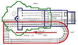 Le martyre de saint Pierre dans ce cirque (en rouge sur le plan) et l'enterrement de l'apôtre dans la nécropole nord expliquent la construction au IV° siècle, sous l'empereur Constantin, d'une basilique (en bleu) située au-dessus de la tombe (carré bleu). Voyez le diaporama en bas de page pour plus de détails.