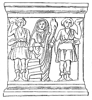 Si l'on met à part le denier de la gens Caesia, qui nous donne l'image officielle des Lares Praestites avec le chien, on peut dire que nous savons fort peu de chose sur la représentation plastique des Lares sous la République. Tibulle nous apprend que pour la maison rustique ils étaient grossièrement taillés dans une souche de bois, ce qui est le cas de toutes les divinités champêtres, comme Silvanus, Faunus, Priape, lesquels ont d'ailleurs avec les Lares plus d'un trait de ressemblance. Cependant, nous savons d'autre part que, dès les temps de la deuxième guerre punique, l'art s'attachait à représenter les Lares d'une façon moins primitive. Un fragment d'une comédie de Naevius nous montre un peintre du nom de Théodote qui, assis dans la cella d'une chapelle et mis à l'abri sous des planches, peint pour les Compitalia des Lares dansants : Lares ludentes. Il n'est pas douteux que dès lors s'élabore le type que nous allons trouver réalisé à partir d'Auguste par de nombreuses statuettes de bronze destinées au culte des Lares domestiques. |