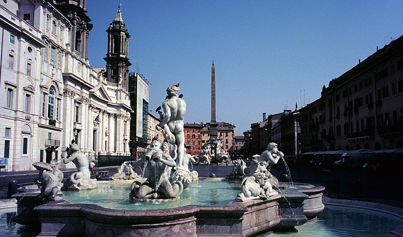 La piazza Navona vue depuis la fontaine du Maure, avec l'obélisque et la fontaine des quatre fleuves en arrière-plan, Rome, 2001