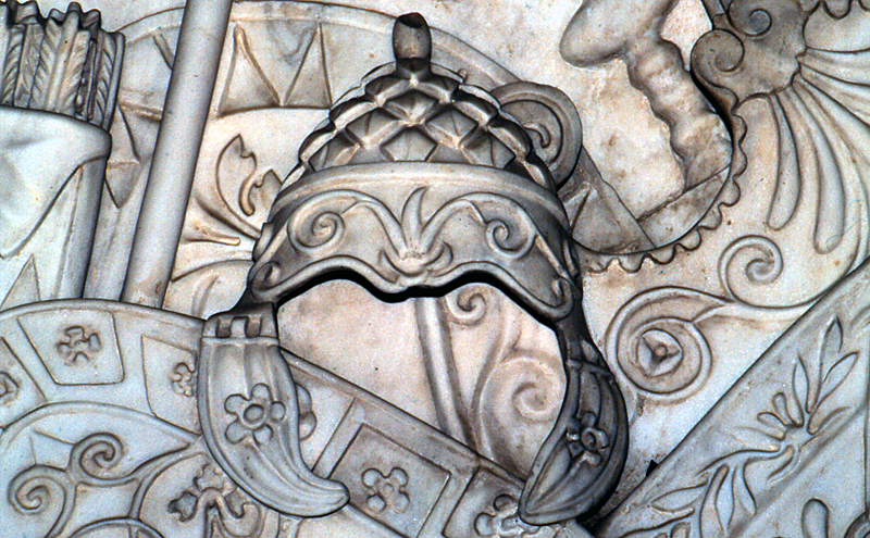 Casque de parade en métal dans un trophée d'armes - Haut-relief en marbre - Ier s. apr.JC - Casa de Pilatos, Séville, 2002 - © Agnès Vinas
