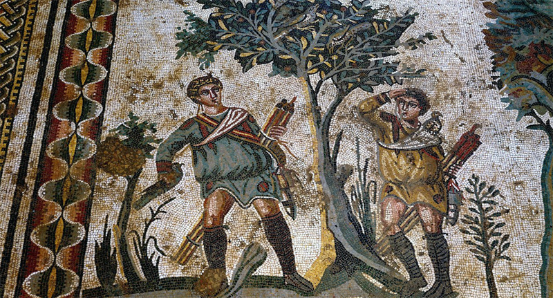 Chasseurs d'oiseaux sur la mosaïque de la Petite Chasse - fin IIIe s. apr.JC - Villa Casale, Piazza Armerina, Sicile