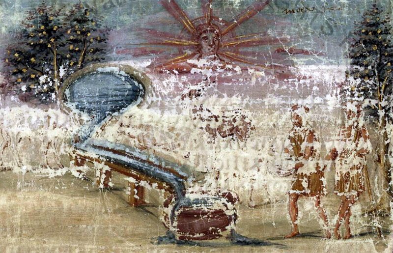 - Canal découvert et artificiel, en bois ou en briquetage, pour fournir de l'eau au bétail dans les prairies et servir d'abreuvoir, comme on le voit par la gravure prise du Virgile du Vatican (Virg. Georg. III, 330 ; Varro, R.R. III, 5, 2 ; Vitruv. VIII, 5, 2 et 6, 1), où il est distingué de tubus et fistula.