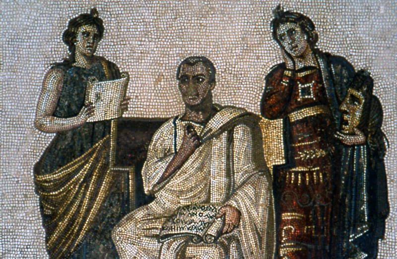 Virgile tient sur ses genoux le livre ouvert de l'Enéide. Il est entouré par les Muses de l'Histoire, Clio, et de la Tragédie, Melpomène