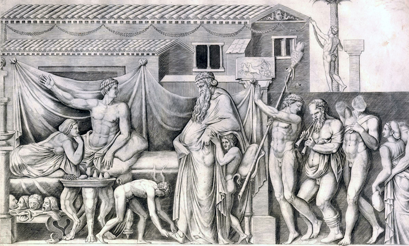 Bacchus visiting the Poet Icarius, after a Roman copy of a Greek relief or painting, known as 'Triclinium' - Gravure anonyme de 1549