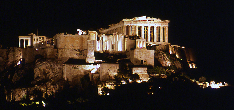 Son et lumière sur l'Acropole d'Athènes, au sommet de laquelle se trouve le Parthénon, temple octastyle dorique
