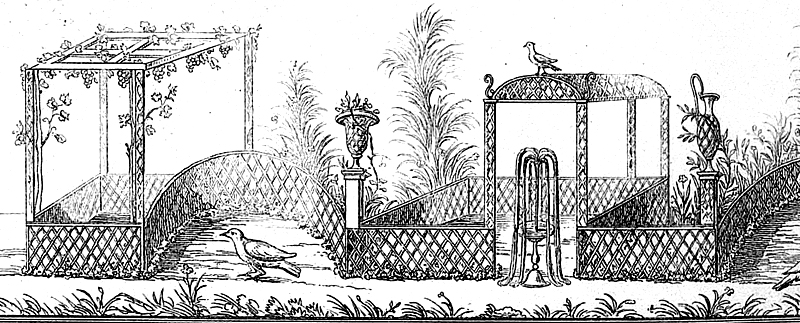 Peinture de Pompéi représentant un viridarium - H. Roux, Herculanum et Pompéi, tome III, planche 25, Paris, Firmin-Didot (1870) - Gallica