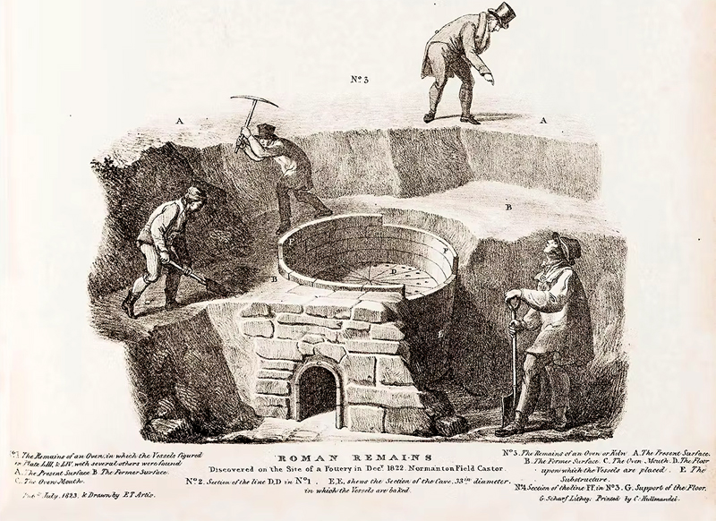 Gravure originale de la découverte du four de Normangate Field - in The Durobrivae of Antoninus, London 1828, plate 40