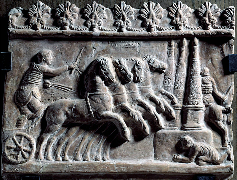 Le grand art de bien conduire consistait à tourner autour de ces points, et à ne pas laisser entre soi et la meta assez d'espace pour qu'un adversaire pût y passer, sans la serrer de trop près et risquer d'être renversé en touchant la base sur laquelle s'élevaient les colonnes. Les oeuvres des poètes sont remplies d'allusions métaphoriques aux chances, aux accidents que causaient les metae et qui avaient lieu à leur pied (Ov. Trist. IV, 8, 35 ; Hor. Od. I, 1, 5 ; Cic. Coel. 31). Comme la course commençait et finissait à la première meta, ce mot est souvent employé, ainsi que notre mot borne, pour désigner la limite, la conclusion de toute chose (Virg. Ov. Stat., etc). La figure est prise d'un bas-relief romain qui représente un cirque. L'ouverture qu'on voit dans la base, sous les colonnes, donne accès à une petite chapelle où était placé l'autel du dieu Consus (Tertull. de Spectac. 5).