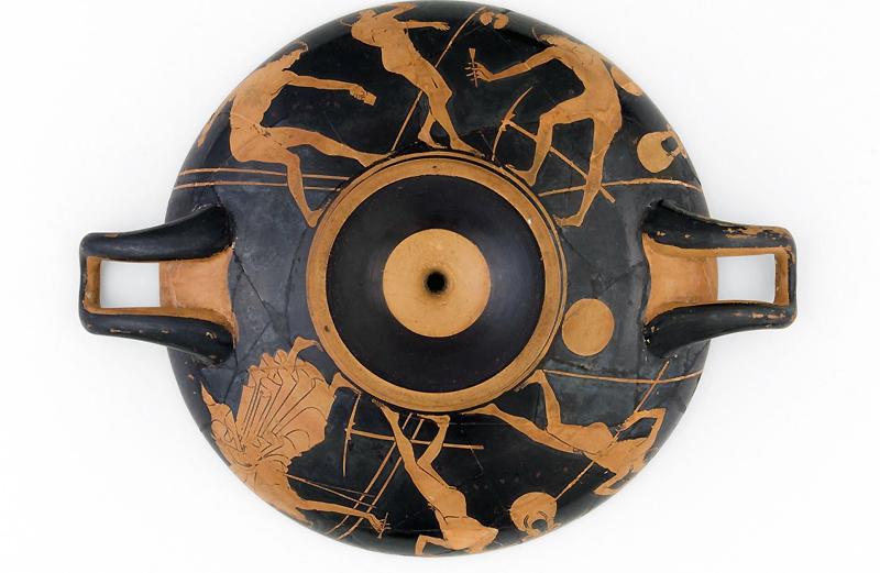 Kylix attique à figures rouges d'Euphronios représentant des athlètes s'entraînant aux cinq épreuves du pentathlon