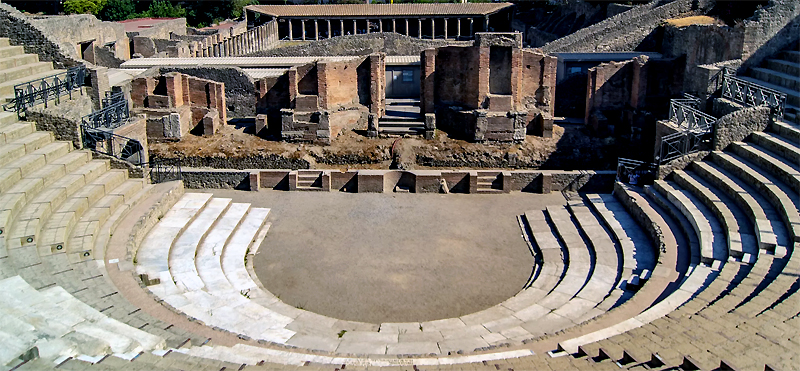 Cavea, aula et base du mur de scène du grand théâtre de Pompei
