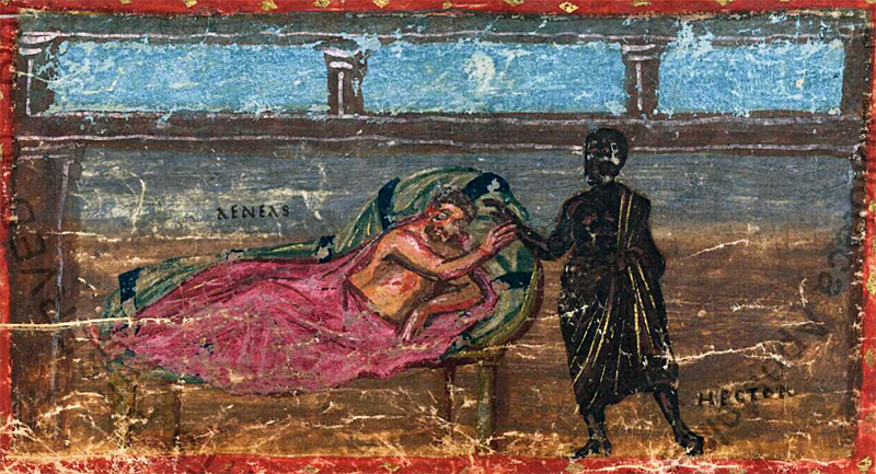 L'ombre d'Hector apparaît dans la chambre d'Enée pendant la nuit de la prise de Troie - Enluminure du Virgile du Vatican