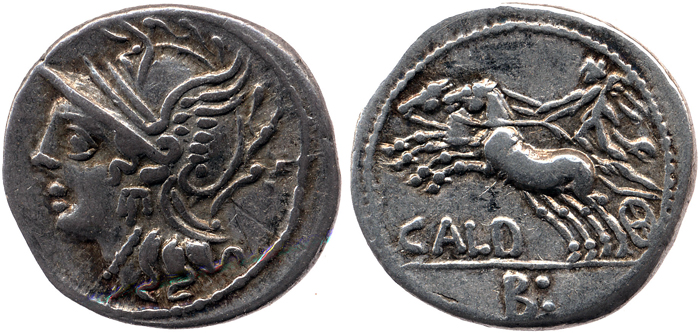 Denier d'argent républicain, frappé en 104 av.JC - Avers : tête de Rome casquée, Revers : bige conduit par une victoire