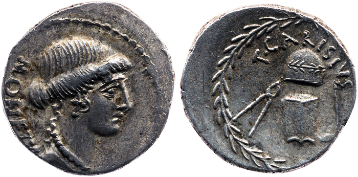 Denier d'argent frappé à Rome en 46 av.JC - Avers : Tête de Junon Moneta ; Revers : Instruments de frappe de la monnaie