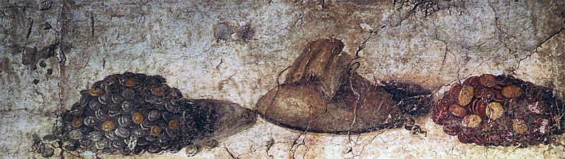 Bourse entre deux tas de pièces de monnaie - Fresque trouvée dans la maison de Julia Felix à Pompéi
