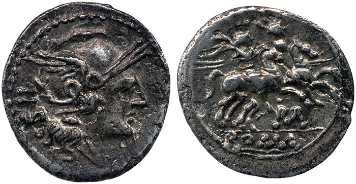 Sesterce d'argent frappé en 211-210 av.JC - Avers : Tête de Rome casquée ; revers : Dioscures - © The Trustees of the British Museum