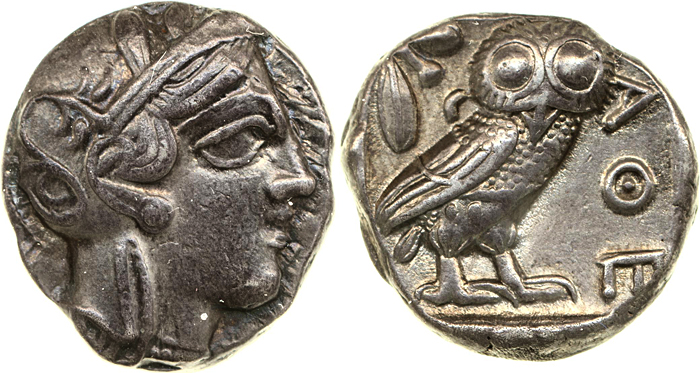 Une des monnaies d'argent d'Athènes, valant quatre drachmes (drachmae), et par conséquent environ 4 fr. de notre monnaie (Liv. XXXIV, 52). La gravure est une reproduction d'une de ces pièces. |