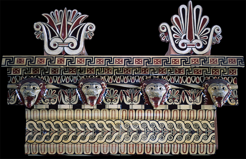 Reconstitution polychrome d'antefixes en terre cuite, et lions gargouilles semblables à ceux de Baalbek.