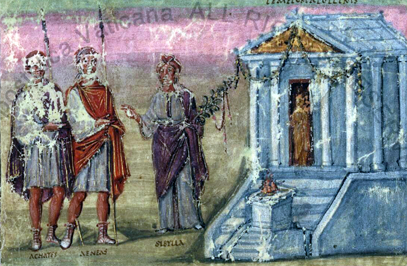 Enée et la Sibylle de Cumes devant le temple d'Apollon - Enluminure du manuscrit dit Vergilius Vaticanus, ms Vat. Lat.3225, fol.45v