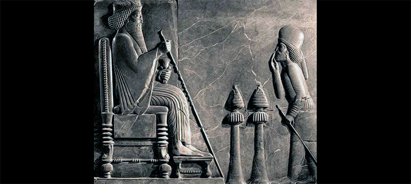 Perse faisant le geste de l'adoration devant le Roi des Rois assis sur un trône surélevé - Détail d'un bas-relief de Persépolis
