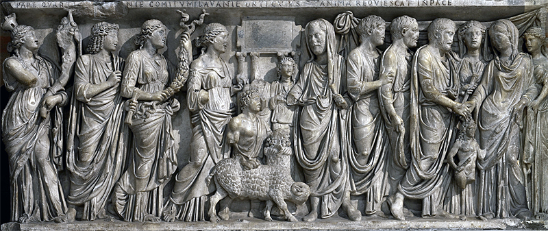 Panneau frontal du sarcophage dit du mariage - 210-220 apr.JC - Intégré dans la tombe du cardinal Fieschi (XIIIe siècle)