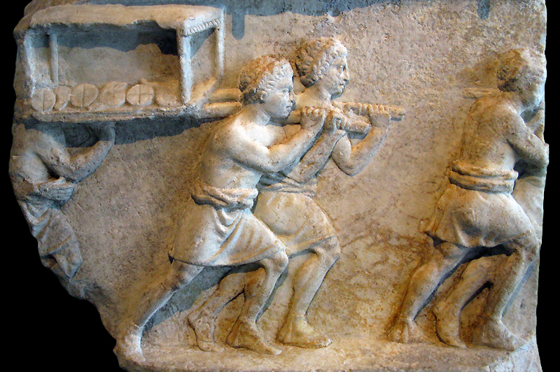 Procession de sacrifice - Des assistants portent sur un ferculum des pains et des quartiers de porc