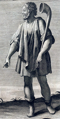 - (λίτυον). Bâton d'augure (Virg. Aen. VII, 187 ; Plut. Rom. 22) ; c'était un bâton court (brevis, Gell. V, 8), recourbé d'un bout comme la crosse épiscopale dont on suppose qu'il a fourni le modèle (Liv. I, 18 ; Cic. Div. I, 17). Il était employé à tracer et à déterminer dans le ciel des divisions idéales, pour deviner l'avenir. Il dut son nom à une certaine ressemblance avec l'instrument militaire que nous venons de décrire (Porphyr. ad Hor. Od. I, 1, 23 ; Gell. l.c. ; Orelli ad Cic. l.c.) ; mais dans les oeuvres d'art, l'extrémité du bâton augural n'est pas légèrement recourbée, comme celle de la trompette nommée lituus, ou de la houlette de berger (pedum) : elle forme une spirale à plusieurs tours, comme dans les figures ci-jointes, dont une représente l'instrument lui-même, d'après la frise d'un ancien temple à Rome, au pied du Capitole, qu'on croit être un temple de Saturne, et l'autre, un augure en personne, la baguette sacrée à la main, d'après une médaille de Marc-Aurèle.