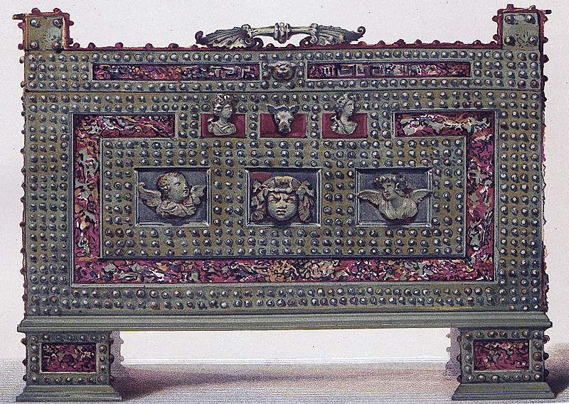 La figure ci-jointe est un modèle remarquable de coffre-fort, découvert dans l'atrium d'une maison à Pompéi ; on croit, avec une grande apparence de raison, que c'était une caisse où le questeur gardait l'argent de l'Etat. Elle repose sur des piédestaux élevés, revêtus de marbre ; la caisse est de bois, doublée de bronze au dedans et plaquée de fer au-dehors. Elle est décrite en détail dans Gell. Pompeiana, t. II, p. 30-31.