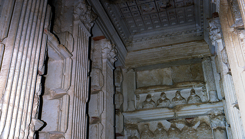 Tombeau-tour d'Elahbel, avec ses travées de loculi séparés par des pilastres cannelés à chapiteaux corinthiens