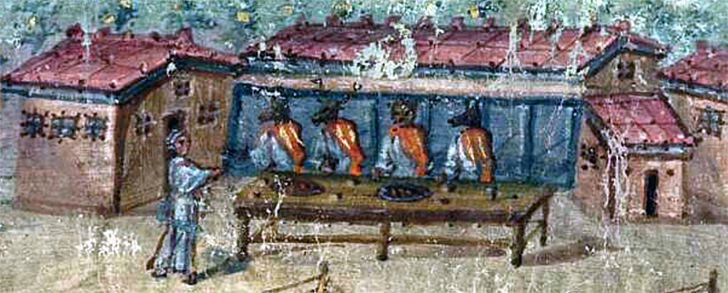 - Table ou étal sur lequel certains marchands, tels que les fruitiers, les volaillers, les pêcheurs, étendaient leurs denrées pour les vendre, dans les rues et les marchés (Hor. Sat. II, 4, 37). La figure représente un étal de cette espèce, couvert de légumes, de volailles et de poissons, dans le forum d'Herculanum, d'après une peinture découverte dans cette ville. Le marchand est assis à côté de son étal, tandis qu'une pratique tend une assiette sur laquelle va être déposé l'objet qu'elle a acheté ; les jarres placées à terre contiennent aussi des comestibles.