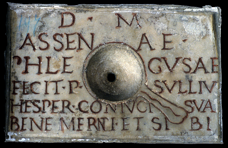 - Pierre funéraire, plate ou carrée, placée sur le reste des morts : monument de l'espèce la plus simple pour honorer la mémoire de ceux qui n'étaient plus (Cic. Leg. II, 26). La figure représente une pierre de cette sorte, trouvée près de Rome ; le trou qui est au milieu servait pour verser des parfums dans l'intérieur du tombeau.