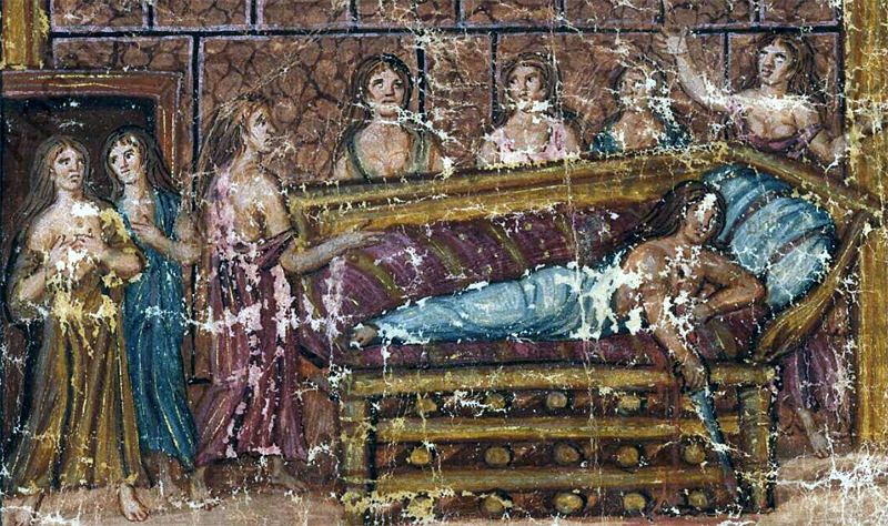 Didon sur son bûcher funéraire - Enluminure du manuscrit dit Vergilius Vaticanus, ms Vat. Lat.3225, fol.41 R