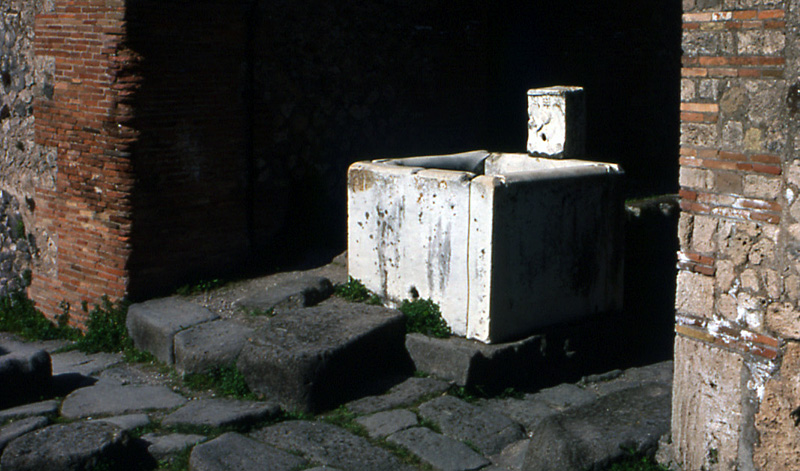 Fontaine au débouché de la rue des Soprastanti ; le trottoir est nettement visible. - Pompéi, Italie, 1977 - © Charles Cavenel