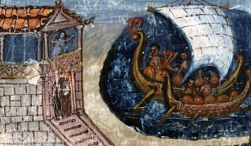 Didon assiste du haut de son palais au départ d'Enée - Enluminure du manuscrit dit Vergilius Vaticanus - Ms Vat. Lat.3225, fol.39v