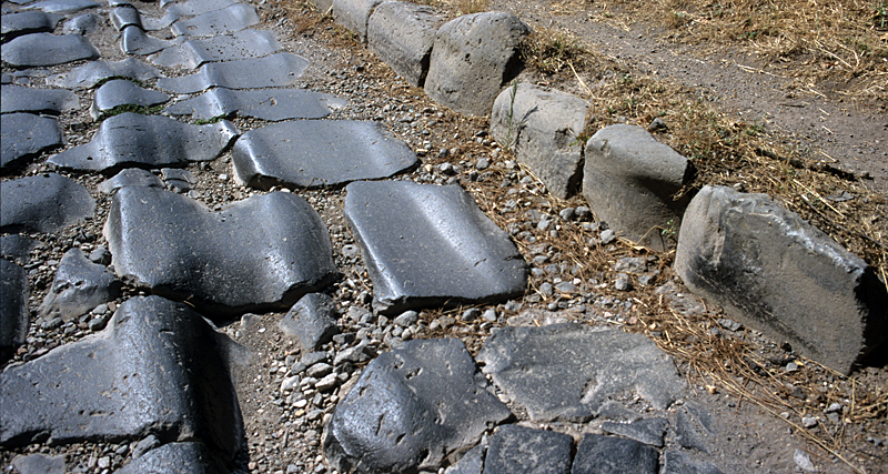 - La grosse pierre de parement qui forme le rebord du trottoir de chaque côté d'une route ou rue, ainsi que le montre la gravure ci-jointe, représentant une partie de la chaussée qui d'Herculanum mène à Pompéi, près de la porte de cette dernière ville.