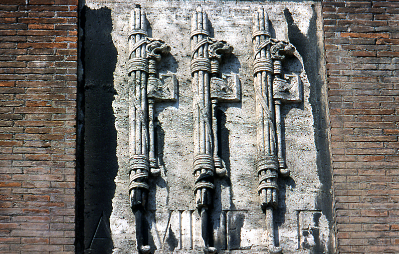 | - Au pluriel, fasces (αἱ ῥάβδοι). Faisceaux portés par les licteurs devant certains magistrats romains : on s'en servait pour battre les malfaiteurs avant l'exécution. Ils se composaient de baguettes de bouleau (Plin. H.N. XVI, 30) ou d'orme (Plaut. Asin. III, 2, 29), assemblées et liées tout autour avec des courroies en forme de fascine. Sous les rois et dans les premières années de la république, on plaçait aussi au milieu des baguettes une hache (securis) ; mais, après le consulat de Publicola, aucun magistrat, excepté le dictateur (Liv. II, 18) n'eut le droit d'avoir les faisceaux avec hache dans la ville de Rome (Cic. De Rep. II, 31 ; Val. Max. IV, 1, 1) : en effet, ils ne furent plus donnés qu'aux consuls à la tête de leurs armées (Liv. XXIV, 9), et aux questeurs dans leurs provinces (Cic. Planc. 41). La gravure donne un specimen des fasces avec la hache, d'après un bas-relief du palais Mattei à Rome.