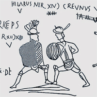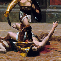La quantité considérable de représentations de gladiateurs parvenues jusqu'à nous, en particulier des mosaïques dans de riches villas, confirme que les jeux de l'amphithéâtre jouaient un rôle non négligeable dans la vie politique par le biais de l'évergétisme : organiser des munera et les offrir au peuple constituait un investissement rentable, et les succès obtenus, fût-ce par la mort des individus engagés dans ces spectacles, pouvaient être immortalisés. Sur la mosaïque de la Villa Borghese, la lettre grecque Θ signale la mort (thanatos) des rétiaires Astivus et Rodan, mais leurs noms ont ainsi échappé à l'oubli, et le commanditaire de la mosaïque a prolongé par l'art, pour lui-même, un succès autrement éphémère. Mais quel regard le public portait-il sur ces jeux organisés à son intention ? La présence d'un amphithéâtre dans chaque ville importante de l'Empire romain indique assez que la masse en redemandait et échangeait sa passivité contre du pain et des jeux (l'expression Panem et Circenses de Juvénal). Mais qu'en pensaient les Romains éduqués ? ceux qui avaient reçu une éducation philosophique ? et plus tard les chrétiens, dont la religion refusait l'homicide ? Voici quelques textes en traduction pour commencer à aborder la question. |