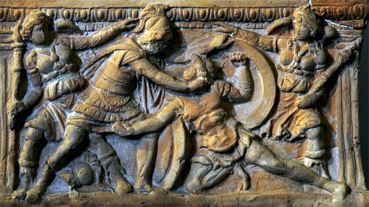 Le combat d'Etéocle contre Polynice - Urne cinéraire de Chiusi - IIe s. avant JC - Musée lapidaire de Maffei, Vérone
