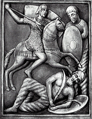 Dans son article de la Revue archéologique en 1971, Michael Speidel croit voir dans la figure humaine de la métope IV qui se dresse devant le cavalier (ci-dessus) un personnage en train de se trancher la gorge de sa main droite avec la sica, une dague recourbée typique de l'armement dace. Il lui semble être coiffé d'une coiffe en demi-globe, ce qui l'identifie comme un noble (pileatus) et pas un soldat ordinaire (comatus). Et l'emplacement de la métope dans une série qui évoque une course-poursuite le conduit à envisager qu'elle représente le moment du suicide de Décébale. Il faut cependant remarquer que la métope est brisée en deux et que la partie inférieure est manquante. Or si l'on en croit la reconstitution d'Eusebiu Mironescu (ci-contre), qui duplique le motif d'autres guerriers daces tombés à terre sur d'autres métopes, Décébale serait plutôt le personnage gisant et non pas celui qui, debout, s'appuie sur son bouclier... |