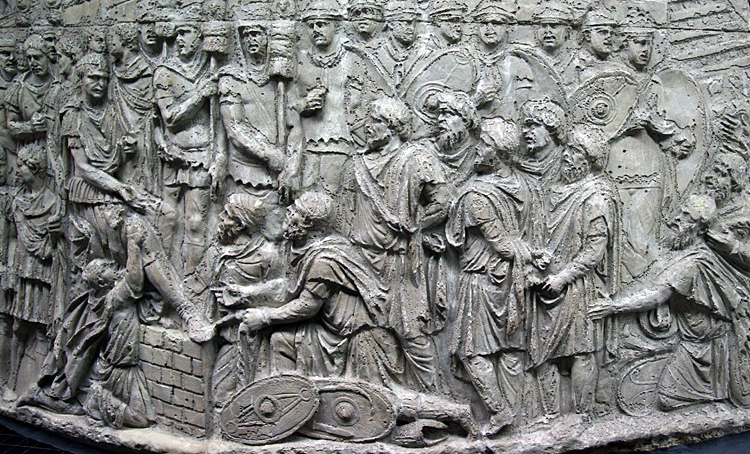 Or si l'on « dézoome » pour observer la totalité de la scène qui occupe un bon quart de spire, on constate que la soumission des Daces est en fait bien plus longue et consiste en un interminable défilé de personnages suppliants, soit agenouillés soit debout mais qui tous ont jeté leurs armes au sol et tendent les bras pour en appeler à la clémence de Trajan. A l'extrémité droite de la série, un personnage debout en hauteur observe la scène et esquisse du bras droit un geste d'accommodement, paume ouverte, mais avec un calme et une autorité manifestement royaux. Emil Panaitescu a d'ailleurs fait justement remarquer que cette composition d'ensemble fait écho à la première qui mettait en images, au cours de la bataille de Tapae, les deux chefs de guerre, Trajan à gauche et Décébale à droite, s'affrontant à distance mais reconnaissant leurs valeurs respectives, avec force et grandeur.