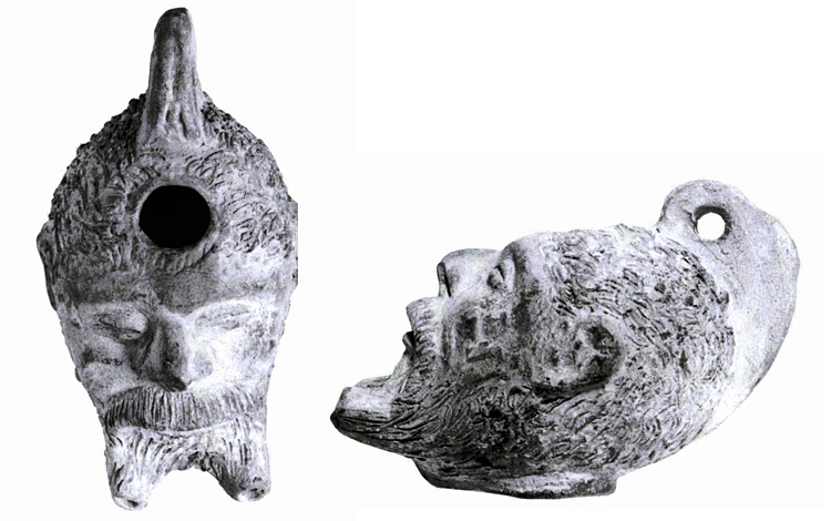 Le Musée national hongrois de Budapest possède une fort intéressante lampe à huile romaine en terre cuite, acquise en 1972 ; d'après les dires de sa propriétaire, elle avait été découverte dans les années 1930 dans une sablière, à Bükkipuszta, dans la commune de Kercseliget (comté de Somogy). Elle se trouvait dans une tombe romaine aujourd'hui disparue. Dimensions de l'objet : L. 11,5 cm, l. 6 cm, H. 7,8 cm Il s'agit d'une lampe à huile en forme de tête humaine, dont la grande ouverture sur le front servait à verser l'huile et les deux petites ouvertures aux deux bouts de la barbe laissaient passer les mèches. La localisation de sa découverte à Kercseliget situe l'objet en Pannonie romaine. |