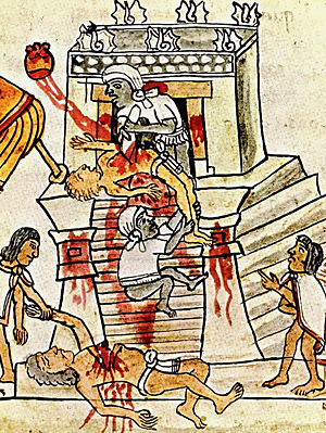 Lorsque les Espagnols ont pénétré en territoire mexicain au début du XVIe siècle, leurs deux réactions immédiates ont été l'admiration pour la splendeur matérielle de la civilisation aztèque, mais tout autant l'horreur devant des sacrifices humains en masse, qu'ils ont qualifié de barbares et qui ont officiellement justifié la nécessité absolue de la conquête, de la réduction en esclavage et de la conversion de peuples aussi sauvages. Il faudrait cependant tenter de comprendre les raisons d'une pratique du sacrifice humain à grande échelle, en s'intéressant à ses fondements religieux mais aussi ses fonctions sociales. Et il faudra aussi se demander pourquoi le film de Mel Gibson, Apocalypto (2006), qui reprend la même thématique chez les Mayas en multipliant les scènes de violence explicite, a obtenu un énorme succès commercial au Mexique même et continue à fasciner le public, malgré le nombre de ses inexactitudes historiques qui semblent ne chagriner que les spécialistes.. |