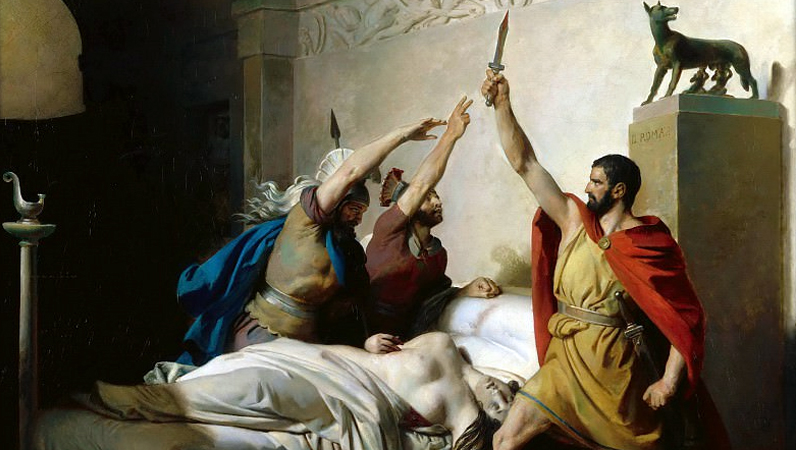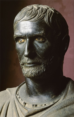A la fin de la République romaine, au Ier s. av.JC, l'état critique des institutions et la guerre civile endémique ont conduit philosophes et historiens à réfléchir au régime politique idéal et à réinventer l'histoire des origines de Rome. C'est ainsi que la figure (légendaire ou historique ?) de Lucius Junius Brutus incarne parfaitement les valeurs et le patriotisme ancestraux, en réussissant le tour de force d'accomplir un tyrannicide sans mettre à mort le tyran mais en mettant à bas la tyrannie, c'est-à-dire tout son système politique : la République est fondée en 509 av.JC. Les historiens contemporains mettent fortement en doute l'authenticité de ce roman national et montrent l'intérêt bien compris de l'ancienne aristocratie romaine qui, s'étant débarrassée de la monarchie étrusque, eut à nouveau l'occasion d'opprimer la plèbe ; mais qu'importe, puisque pour la postérité, Brutus l'ancien est devenu le symbole d'un tyrannicide réussi... |