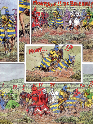 « Les gens de la compagnie vinrent avec leurs femmes et leurs enfants dans une belle plaine où il y avait un marécage. De ce marais, ils firent un bouclier. Apprenant que l’ennemi allait se présenter, ils labourent toute la partie où ils comptent engager le combat, puis ayant creusé un fossé autour et ouvert des canaux, ils inondent la plaine. Le comte vint en ordre de bataille au-devant de la Compagnie avec sept cents chevaliers français, tous aux éperons d’or, et avec beaucoup d’autres du pays, ainsi qu’avec ses fantassins. Il se plaça lui-même à l’avant-garde avec sa bannière et chargea. Car voyant la plaine couverte d’un épais tapis d’herbe et ne soupçonnant rien, ils courent sus aux ennemis qui restent immobiles au bout du terrain. Mais avant d’avoir atteint le milieu de la plaine, comme entravés par de solides chaînes, les chevaux roulent dans la boue avec leurs cavaliers, ou bien débarrassés d’eux galopent au hasard dans la plaine. Encouragés par ce spectacle, les Catalans les encerclent en les accablant de toutes sortes de traits, les égorgent tous jusqu’au dernier. » « Il n’en réchappa que deux. L’un des deux était messire Roger Desllor, un chevalier du Roussillon qui avait été souvent envoyé comme messager à la Compagnie. Des fantassins, il en mourut plus de vingt mille, car les Catalans s’élancent immédiatement sur les traces des fuyards, les poursuivent jusqu’à Thèbes et Athènes, dont ils s’emparent facilement avec leurs richesses, leurs femmes et leurs enfants. » |