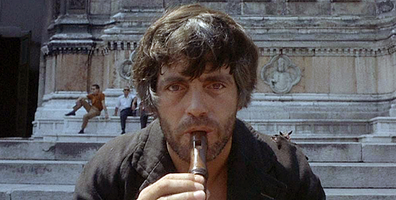 Dans une première séquence on le voit, nouvelle figure christique mais jouant ici de la flûte pour lui seul, au pied d'une église, face à l'indifférence totale des passants bourgeois. Le cinéaste a toujours été fasciné par le Christ, comme le prouvent ses films précédents, L'Evangile selon saint Matthieu ou La Ricotta. La séquence suivante le montre près d'usines, entouré d'ouvriers, et jouant toujours dans la plus grande des solitudes. Œdipe-Pasolini a beau être fasciné par Marx, le monde des ouvriers et des banlieues, il n'en est pas moins désespéré, son seul repère restant à l'image Angelo, joué par Ninetto, son amant remplaçant fort logiquement la fidèle Antigone du dramaturge. L'art n'en reste pas moins ce qui lui a permis de sublimer son complexe, il est devenu un voyant au sens rimbaldien.
