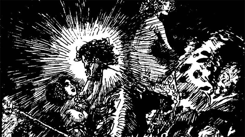 Il faut suivre la bande infernale toute la nuit, monté sur un noir coursier. A ses côtés, sur un âne, trotte un petit homme... Dieu du ciel !