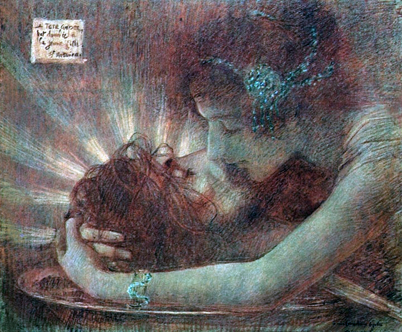Lorsque les soldats d'Hérode eurent enfermé le Baptiste dans les geôles de Machaerous, Hérodiade fut joyeuse de vivre près de celui qu'elle chérissait ; mais alors des désirs l'assaillirent, elle pensa à ces joies des possessions premières qui embellissent le visage des amants, elle sentit faiblir sa volonté, elle craignit d'être un jour semblable à celles qui, de leurs propres mains, se plaisent à détruire le bonheur que donnent les illusions des passions violentes et vierges. Elle ne pensa pas que le prophète pût refuser le don de cette chair, qu'elle redoutait de lui offrir ; la pensée qu'un jour il la repousserait loin de lui, renversant ainsi ce palais de rêveries et de visions que sa jeunesse et son adolescence avaient construit, cette pensée lui fut odieuse, et elle vit que la mort seule pourrait la délivrer de ce danger. Comme elle était femme, inconsciemment égoïste, désireuse de bonheur et cruelle, elle ne songea pas à mourir, et quand elle eut obtenu le serment d'Hérode, après avoir dansé devant lui, c'est la tête de Jean qu'elle demanda au roi, la tête qui, pâlie et froide, ne refusa pas son baiser lorsqu'elle la prit des mains du bourreau qui venait d'être le protecteur de son rêve et de son amour.