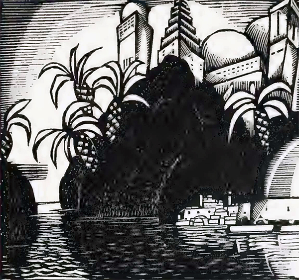 En trois pâtés aux pylônes trapus et nus, cours intérieures, galeries, caveaux, et le fameux parc-suspendu avec ses jungles viridant aux brises atlantiques, et l'observatoire ayant l'oeil en vigie à deux cents mètres chez le ciel, et cent rampes de sphinx et de cynocéphales : le palais tétrarchique n'était qu'un monolithe, dégrossi, excavé, évidé, aménagé et finalement poli en un mont de basalte noir jaspé de blanc qui projetait encore une jetée de sonore trottoir, à double file de peupliers violet-gros-deuil en caisses, fort avant dans la solitude mouvante de la mer jusqu'à cet éternel rocher, l'air d'une éponge ossifiée, tendant un joli phare d'opéra-comique aux jonques noctambules.