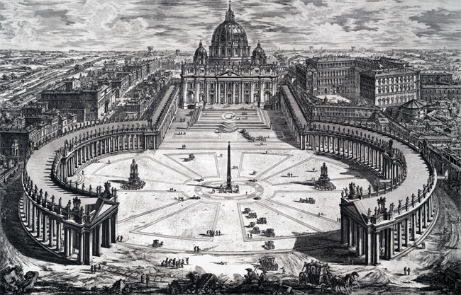 En 1586, après la construction d'une nouvelle basilique (en vert sur le plan), l'obélisque fut transféré par l'architecte Fontana, sur l'ordre du pape Sixte Quint, au centre de la place saint Pierre. Au siècle suivant, le Bernin donna à cette dernière l'allure monumentale qu'elle a encore de nos jours.